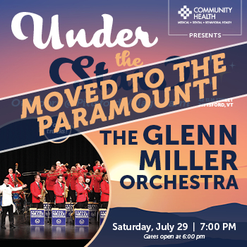 In anticipation of heavy rain on the day of the event, Saturday’s Glenn Miller Orchestra performance has been moved indoors to The Paramount Theatre at 30 Center St. in Rutland. Those that have already purchased a ticket needn’t do a thing – those tickets will get you in the door! Please note that children 12 and under are still free and do not need a ticket. No outside food and drink is allowed in the theatre. Doors open @ 6PM, General Admission seating begins @ 6:30PM.