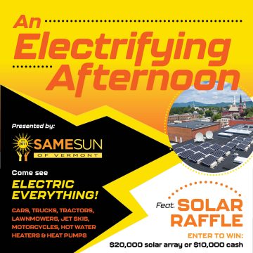 Be Same Sun of Vermont’s guest and see electric everything: cars, trucks, tractors, lawnmowers, jet skis, motorcycles,  water heaters and heat pumps. See the future now!